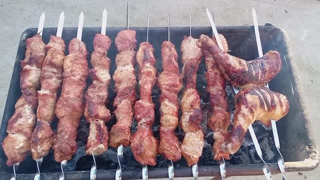 Процесс приготовления шашлыка и молодого картофеля.