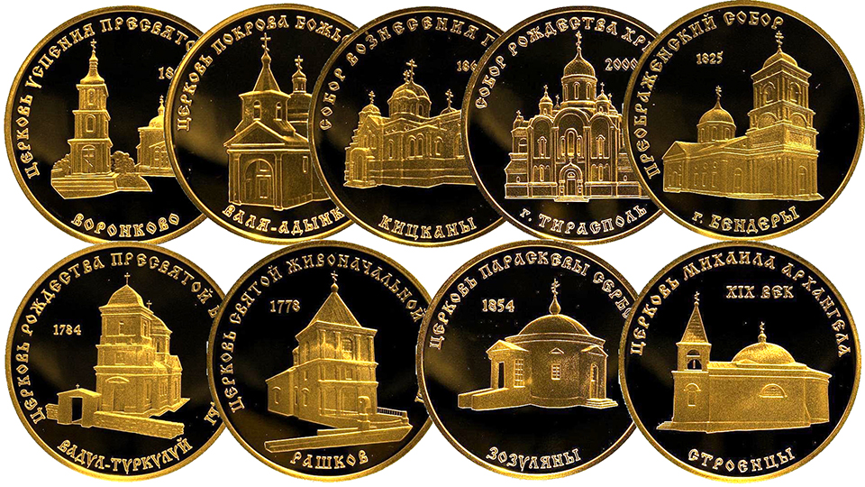 Золотые монеты Приднестровья выпуска 2001 года.
