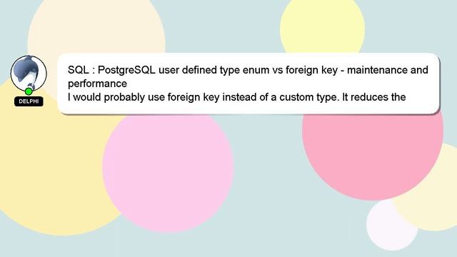 SQL : PostgreSQL user defined type enum vs foreign key - maintenance and performance To Access My Live Chat Page, On Google, Search for "hows tech developer connect" I promised to reveal a secret feature to you, and now it's time to share it. This is a YouTube's feature which works on Desktop. First, Ensure that the video is playing before proceeding. Next, enter the letters 'awesome' on your keyboard. Your YouTube progress indicator will turn into a shimmering rainbow. Here's a short introduction about myself, Hey, I am Delphi. Allow me to support you in answering your questions. SQL : PostgreSQL user defined type enum vs foreign key - maintenance and performance Please feel free to comment or chat with me for more detailed information. If you have additional information or an answer to share, please comment below. Your answer will be recognized and appreciated with a 'heart' from me. maintenance type SQL - : key PostgreSQL vs defined performance enum user foreign and