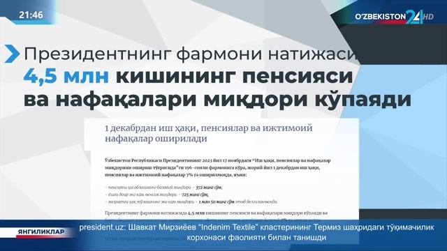 Президент фармони билан 1 декабрдан иш ҳақи, пенсиялар ва ижтимоий нафақалар 7% га оширилмоқда