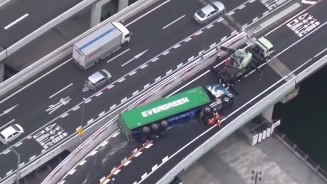 На главной автомагистрали в Осаке грузовик компании EVERGREEN по классике упал на бок и перекрыл движение.