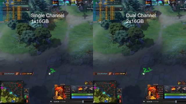 Side-by-side comparison running DOTA 2 (Aug 2018) with Single channel vs. Dual channel RAM on a laptop. noticed a massive increase, between 30-50% Laptop specs: Gigabyte Aero 14 7700HQ i7 7700HQ 1x16GB/ 2x16GB DDR4 2400 GTX 1060 512GB M2 SATA SSD https://www.gigabyte.com/au/Laptop/AERO-14--i7-7700HQ#kf DOTA settings 2560x1440 All settings maxed, except Shadows on High Vsync Off