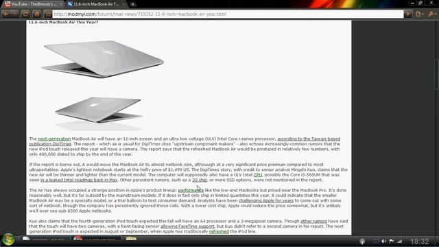 The next-generation MacBook Air will have an 11-inch screen and an ultra-low voltage (ULV) Intel Core i-series processor, according to the Taiwan-based publication DigiTimes. The report - which as is usual for DigiTimes cites "upstream component makers" - also echoes increasingly-common rumors that the new iPod touch released this year will have a camera. The report says that the refreshed MacBook Air would be produced in relatively few numbers, with only 400,000 slated to ship by the end of the year. If the report is borne out, it would move the MacBook Air to almost netbook size, althouugh at a very significant price premium compared to most ultraportables: Apple's lightest notebook starts at the hefty price of $1,499 US. The DigiTimes story, with credit to senior analyst Mingchi Kuo, claims that the new Air will be thinner and lighter than the current model. The computer will supposedly also have a ULV Intel CPU, possibly the Core i5-560UM that was seen in a leaked Intel roadmap back in May. Other persistent rumors, such as a 3G chip, or more SSD options, were not mentioned in the report. The Air has always occupied a strange position in Apple's product lineup: performance like the low-end MacBooks but priced near the MacBook Pro. It's done reasonably well, but it's far outsold by the mainstream models. If it does in fact only ship in limited quantities this year, it could indicate that the smaller MacBook Air may be a specialty model, or a trial balloon to test consumer demand. Analysts have been challenging Apple for years to come out with some sort of netbook, though the company has persistently ignored those calls. With a lower cost chip, Apple could reduce the price somewhat, but it's unlikely we'll ever see sub-$500 Apple netbooks. Kuo also claims that the fourth-generation iPod touch expected this fall will have an A4 processor and a 3-megapixel camera. Though other rumors have said that the touch will have two cameras, with a front-facing sensor allowing FaceTime support, but Kuo didn't refer to a second camera in his report. The next generation iPod touch is expected in August or September, when Apple has traditionally refreshed the iPod line.