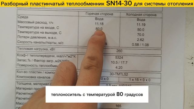 https://www.ozon.ru/product/plastinchatyy-razbornyy-teploobmennik-sn14-30-dlya-otopleniya-moshchnost-260-kvt-1393178633/ Разборный пластинчатый теплообменник SN14-30, 260 кВт для системы отопления здания 2600м2. Аппарат обладает следующими характеристиками: 1. Тепловая нагрузка 260 кВт 2. Горячая сторона. Вход: 80С, Выход: 60С 3. Холодная сторона (отопление внутр.) Вход: 50С, Выход: 70С Массовый расход 11,19 т./ч. 4. Фланцы: Ду50. 5. Поверхность теплообмена (4,20м2) - 30 пластин ✅ Пластины теплообменника изготовлены из нерж. стали - AISI316 ✅ Высокие рабочие характеристики: макс. рабочее давление - 16 бар., макс. рабочая температура - 160С. ✅ Гарантия 3 Года ✅ Разборная конструкция позволяет легко промывать и обслуживать теплообменник. Мы производим пластинчатые теплообменники с 2009 года, поэтому можем предложить вам лучшие условия: ? - Предложим цену на 30% ниже рынка! ??️ - Изготовим ваш теплообменник за 1 день! ? - Надежно упакуем и доставим оборудование на ваш объект! ?? - Доставим теплообменник в любую точку России! ? - Расчет теплообменников ведется в сертифицированной программе расчета. Подберем на любую мощность и посчитаем за 15 минут! ? - Постоянная сервисная поддержка!