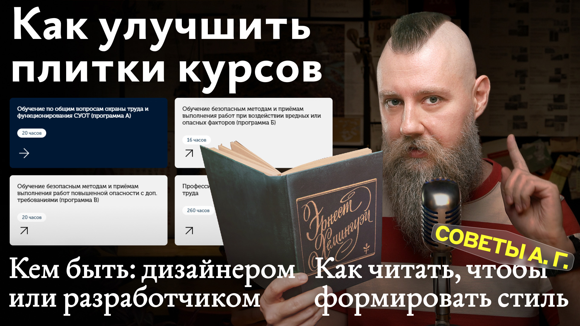 Дистанционный практический курс Михаила Нозика «Типографика и вёрстка» пройдёт с 4 по 24 сентября. При записи до пятницы 25 августа стоимость ниже на 10%: https://bureau.ru/courses/typography-online/?utm_source=yt-n-c-typographyonline-210823 Сегодня отвечаю на ваши вопросы о том, как улучшить внешний вид плиток на странице сайта; как идентифицировать себя в профессии и как читать, чтобы формировать чувство стиля в письме. Приз за самый интересный вопрос я хочу вручить Илье Привалихину и предложить ему персональную скидку 40% на лекции по выбору: «Типографика и вёрстка» Михаила Нозика или «Пользовательский интерфейс и представление информации» Ильи Бирмана: https://bureau.ru/lectures/typography/?utm_source=yt-n-b-typography-210823 https://bureau.ru/lectures/ui/?utm_source=yt-n-b-ui-210823 Задать вопрос или написать А. Г.: bureau.ru/soviet/ask/, artgorbunov@artgorbunov.ru Приятного просмотра! 0:00 Михаил Нозик просил передать 0:51 Илья Привалихин: На работе коллективным тестированием и небольшим количеством страданий мы выявили, что экран-плитка со страницы, где располагаются все курсы, был изначально задуман маленько неправильно с точки зрения восприятия и вообще отображается не так, как хотелось бы в итоге. Часть можно поправить в админке сайта, благо такая возможность есть, но остаётся сам вопрос с внешним видом плиток: из плана-минимум придумали поиграть с количеством колонок и после этого для особо важных вещей делать плитки в две колонки. А с цветом особо возможностей поработать нет: плитки при наведении курсора меняют цвет, а отрубать эту фичу не хотелось бы, т.к. она может немного сломать пользователю мозг (есть элементы с похожим функционалом). Что бы вы посоветовали? 5:13 Владислав Куликов: Я программист, занимаюсь разработкой мобильных приложений. Но ещё я дизайнер. Долгое время не мог определиться, чем же мне больше всего нравится заниматься в жизни: дизайном или разработкой. В итоге я решил заниматься и тем, и другим. Уж очень я люблю дизайн, но и разрабатывать цифровые продукты мне нравится. Кто теперь я? Все ещё программист или дизайнер? А может просто разработчик? Или кросс-дисциплинарный дизайнер? Не могу понять как теперь идентифицировать себя. 6:04 Rerih: Как читать, чтобы больше понимать и формировать чувство стиля? 9:58 Награждение автора лучшего вопроса 10:43 В следующих выпусках _______________ Этот совет на сайте бюро: https://bureau.ru/soviet/20230821/?utm_source=yt-s-s-na-210823 _____________ Авторы видео: А. Г. — А. Г. оператор — Ника Сикорская монтажёр — Маргарита Жевняк дизайнеры — Миша Нозик, Матвей Рогов редактор — Андрей Терещенко _______________ Анонсы проектов бюро, курсов, книг и наборов в школы: в Фейсбуке — https://www.facebook.com/bureaugorbunov/ Телеграме — https://t.me/bureaugorbunov/ Контакте — https://vk.com/burosfera/ Твитере — https://twitter.com/artgorbunov/ Яндекс-дзене — https://zen.yandex.ru/id/5c651711e9ed8e00ac2410be Коворкафе — место, коворкинг и клуб Бюросферы, кофе-бар для всех: https://bureau.ru/coworkafe/