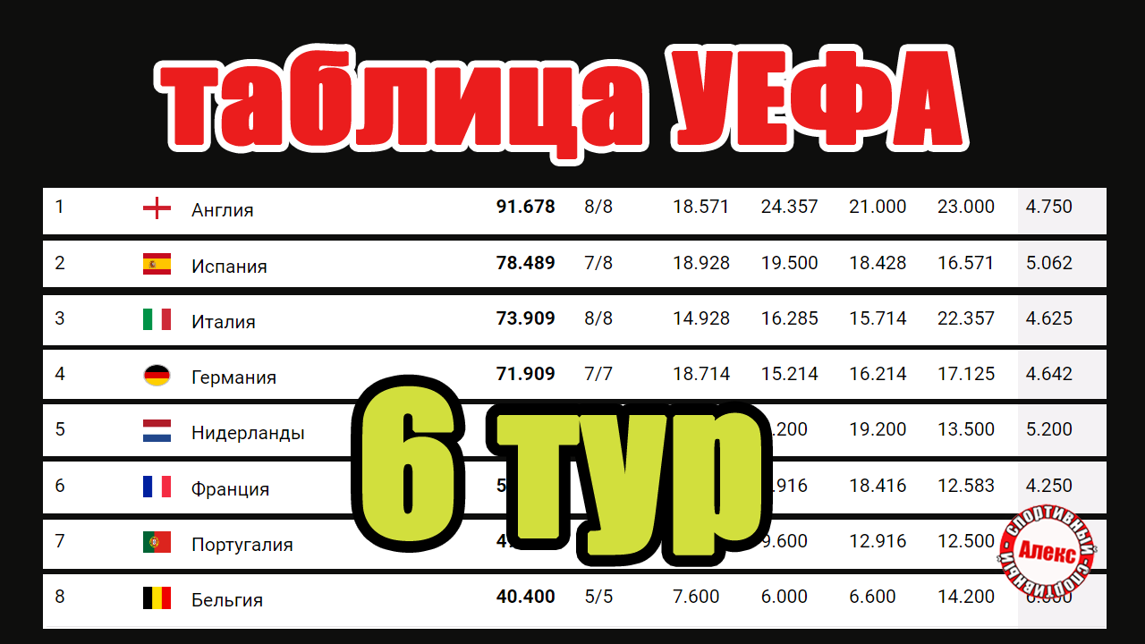 Таблица коэффициентов после 6 тура Лиги Чемпионов. Кто стал лидером недели? Россия опустилась на 29-