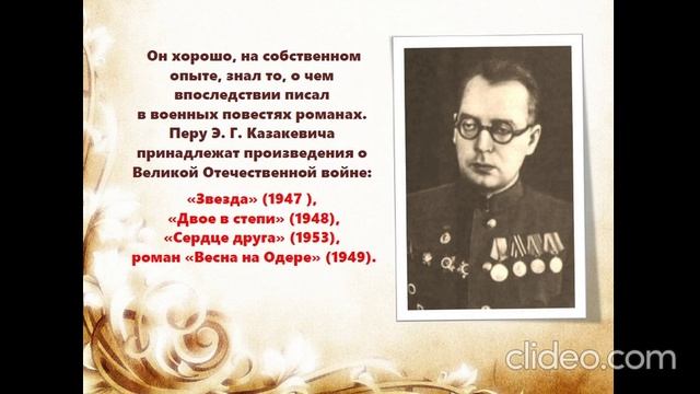 Эммануил Генрихович Казакевич родился (11) 24 февраля 1913 года в городе Кременчуг Полтавской губернии, в семье еврейского публициста. В 1930 году он окончил машиностроительный техникум в Харькове. В следующем году семья Казакевичей перебралась в Биробиджан, в Еврейскую автономную область. В 1938 году Казакевич переехал в Москву. Во время Великой Отечественной войны служил на фронте. Войну закончил в должности помощника начальника разведки армии. Первая же повесть на русском языке «Звезда» (о героизме советских разведчиков в годы войны) принесла писателю Сталинскую премию в 1948 году и широкую известность. В 1950 году Казакевичу присуждена ещё одна Сталинская премия за роман «Весна на Одере». Его перу также принадлежат роман о последних днях войны «Дом на площади» (1956), повесть о Ленине «Синяя тетрадь» (1961), рассказы (в том числе «При свете дня», «Приезд отца в гости к сыну», «Враги» и другие), путевые заметки «Венгерские встречи» (1955), незаконченный роман «Новая земля» и другие произведения. Основная тема произведений Казакевича - встающие перед людьми в разных жизненных ситуациях проблемы долга, вины и свободы воли, а также ценность человеческой жизни. Для его книг характерны образная и тематическая преемственность, духовное родство положительных героев, их гражданская ответственность и стремление осмысливать свои поступки и поступки товарищей. Помимо литературного творчества Казакевич выступал и как публицист, критик и переводчик. В частности, он перевел на идиш стихотворения А.С. Пушкина, М.Ю. Лермонтова, В.В. Маяковского, а еще в его переводе на русский язык несколькими переизданиями вышла сказочная повесть К. Коллоди «Приключения Пиноккио». Многие произведения писателя были экранизированы, его книги переведены на иностранные языки. Кстати, прозаические произведения он писал в основном на русском языке, а поэзию — на идише. Подготовлено ведущим библиотекарем отдела обслуживания Центральной библиотеки г.Анапа Ю.В. Ковалевой