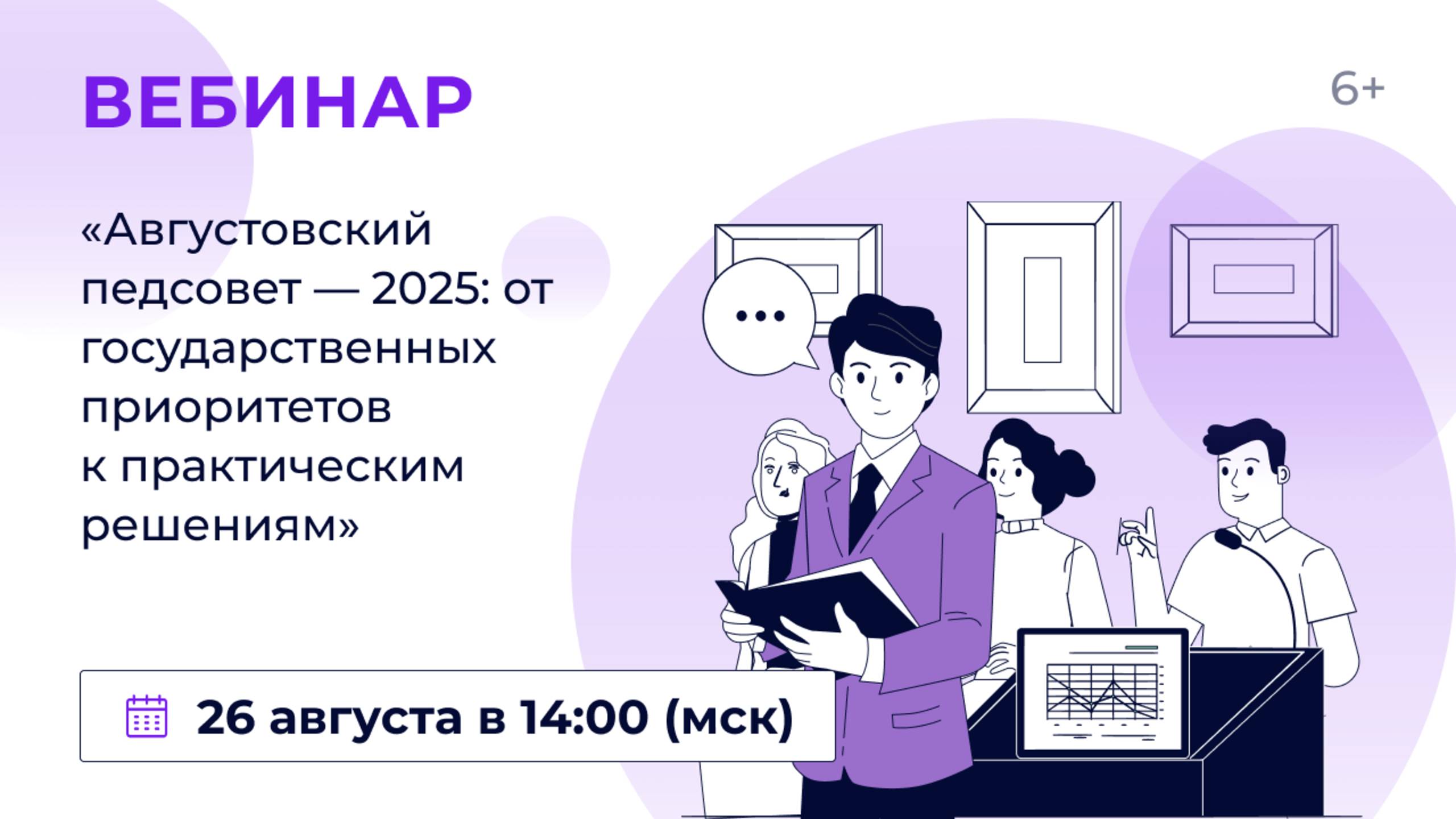 26 августа в 14:00 (мск) приглашаем учителей, преподавателей организаций СПО, методистов, педагогов дополнительного образования, заместителей директоров, руководителей образовательных организаций и представителей ИРО на вебинар «Августовский педсовет — 2025: от государственных приоритетов к практическим решениям». На предстоящем педсовете обсудим: - ключевые тренды 2025/2026 учебного года; - практические кейсы от наших экспертов; - готовые цифровые решения для повышения качества образования; - инструменты для профессионального роста и развития педагогов и управленцев. В рамках мероприятия вы сможете услышать опытных учителей, представителей высшей школы, экспертов в области образования и задать им интересующие вас вопросы.