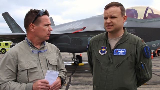 Tom Demerly from TheAviationist interviews an USAF F-35A Lightning II Joint Strike Fighter instructor pilot from the 33rd Fighter Wing at Eglin AFB in Florida at the 2018 Thunder Over Michigan Airshow in Ypsilanti, Michigan.