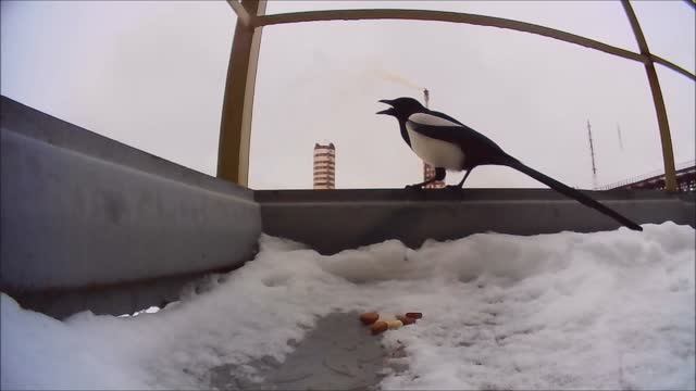Сорока любит арахис, за один подлет, набирает в клюв по 7 орешков, Вяжищи, 08.02.2023