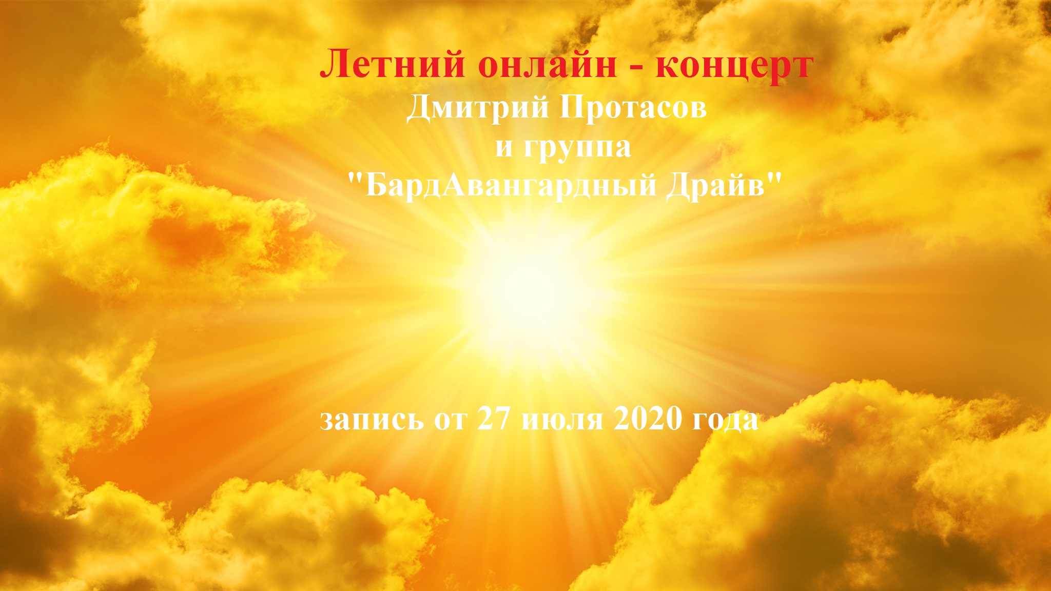 Это Летний онлайн - антикоронавирусный концерт от 27 июня 2020 года. Можно сказать семейный квартирник. Так наша семья боролась с коронавирусом. Для Вас играет группа "БардАвангардный Драйв" в составе: Мама - Инна Протасова (варган, гармоника, тамбурин и маракасы); Дочь - Инна Протасова (младшая) ( стихи, синтезатор); Сын - Данила Протасов - (ударная установка , барабан Конго); Папа - Дмитрий Протасов - (вокал, музыка, стихи, гитара) Вы прослушаете песни: 1. "Замерли" (Андрей Вознесенский - Дмитрий Протасов) 2. "Вредная , неверная, наверно..." (Николай Рубцов - Дмитрий Протасов) 3. "Они целовались впервые" (Юрий Щербаков - Дмитрий Протасов) 4. "Love me tender" (W.W. Fosdick - Дмитрий Протасов (автор кавер - версии)) 5. "Недотрога (посвящается супруге Инне)" (Дмитрий Протасов) 6. "Долго же шел ты, в конверте листок" (Владимир Высоцкий - Дмитрий Протасов) 7. "Кухонный блюз" (Дмитрий Протасов) 8. "Мне бы хотелось..." (Инна Протасова - Дмитрий Протасов) 9. "Я еду к морю" (Дмитрий Протасов) 10. "Hit the road Jack" (Percy Mayfeld - Дмитрий Протасов (автор кавер - версии)) Приятного прослушивания и ДО НОВЫХ ВСТРЕЧ!!!!