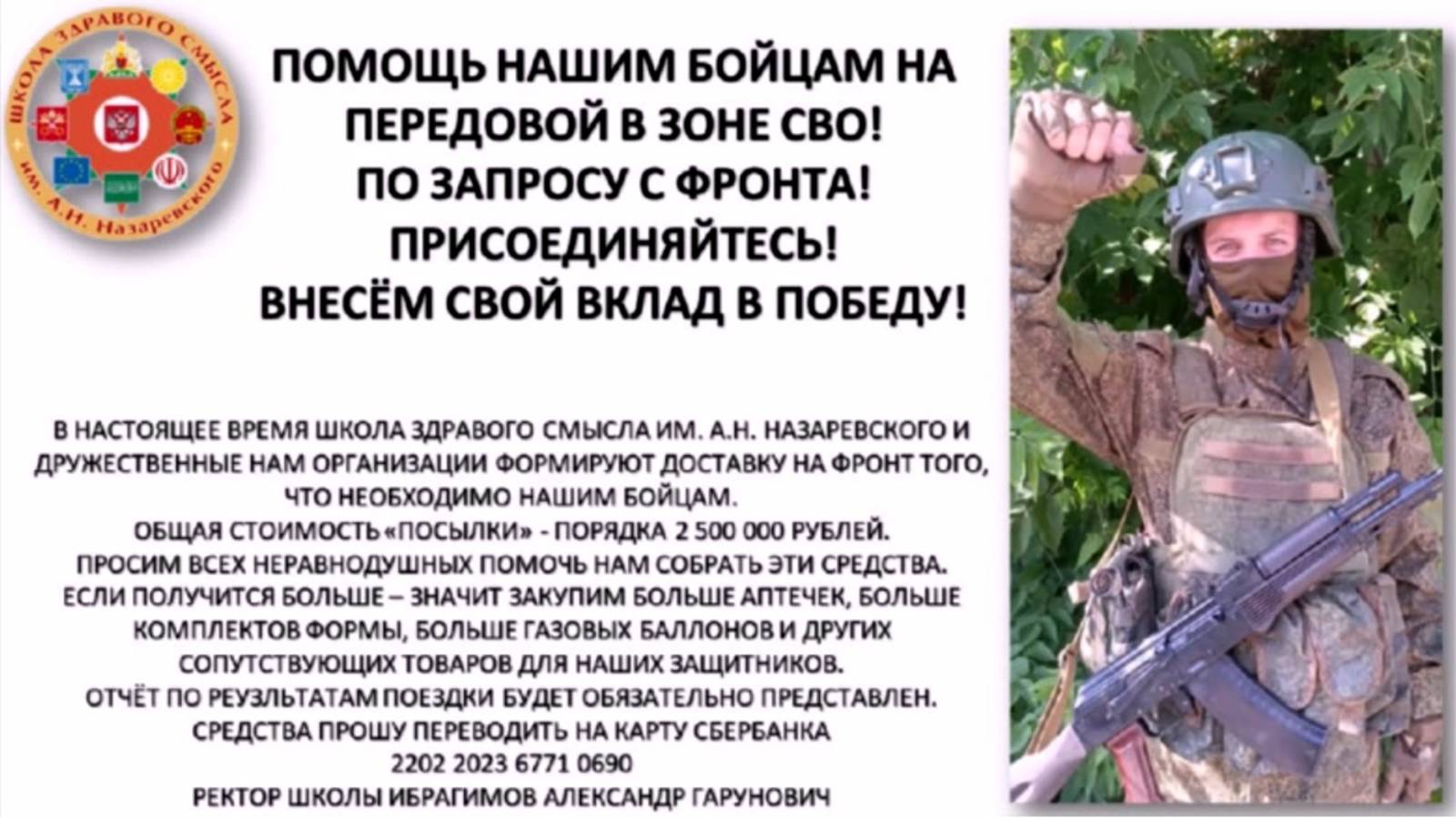 В настоящее время Школа Здравого Смысла им А.Н. Назаревского и дружественные нам организации формируют доставку на фронт того, что необходимо нашим бойцам. Общая стоимость «посылки» - порядка 2 500 000 рублей. Просим всех неравнодушных помочь нам собрать эти средства. Если получится больше - значит закупим больше аптечек, больше комплектов формы, больше газовых баллонов и других сопутствующих товаров для наших защитников. Отчёт по результатам поездки будет обязательно представлен. Средства прошу переводить на карту Сбербанка - 2202 2023 6771 0690 Александр Гарунович Ибрагимов, ректор Школы Здравого Смысла им А.Н. Назаревского.