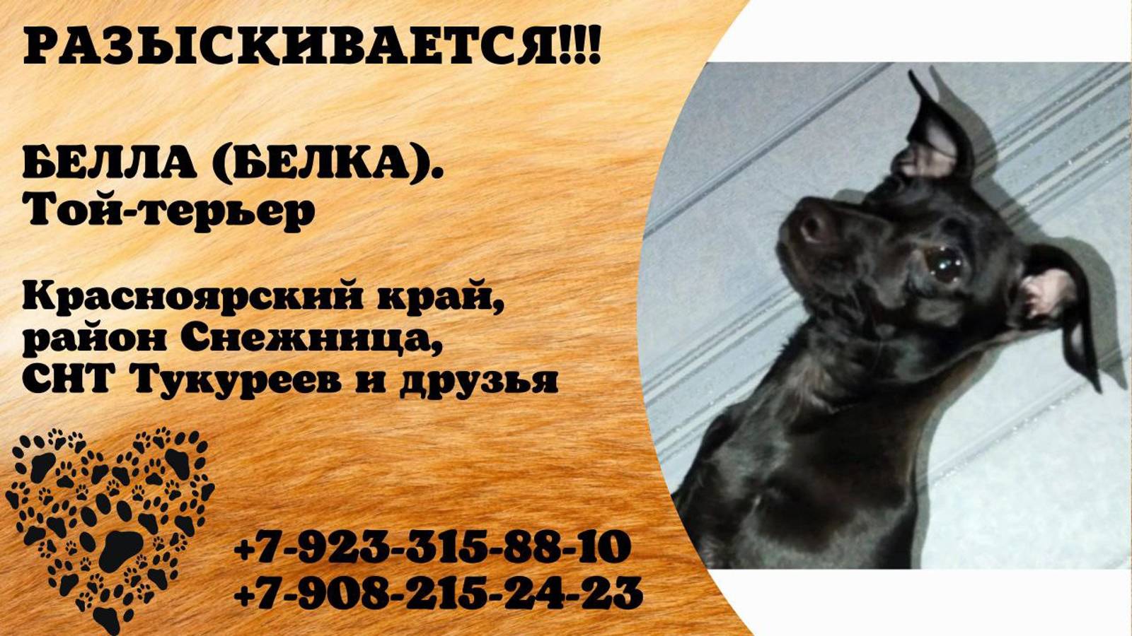 Красноярский Красноярск Пропала собака окрас чёрный, хвост купированный, порода той терьер, откликается на кличку Белла и белка, нашедшим вознаграждение, просьба позвонить по указанным номерам: 89233158810 - Дарья 89082152423 - Максим 89233796668 - Ирина ВАЖНА ЛЮБАЯ ИНФОРМАЦИЯ!!! Инфо https://vk.com/wall-198815410_154158