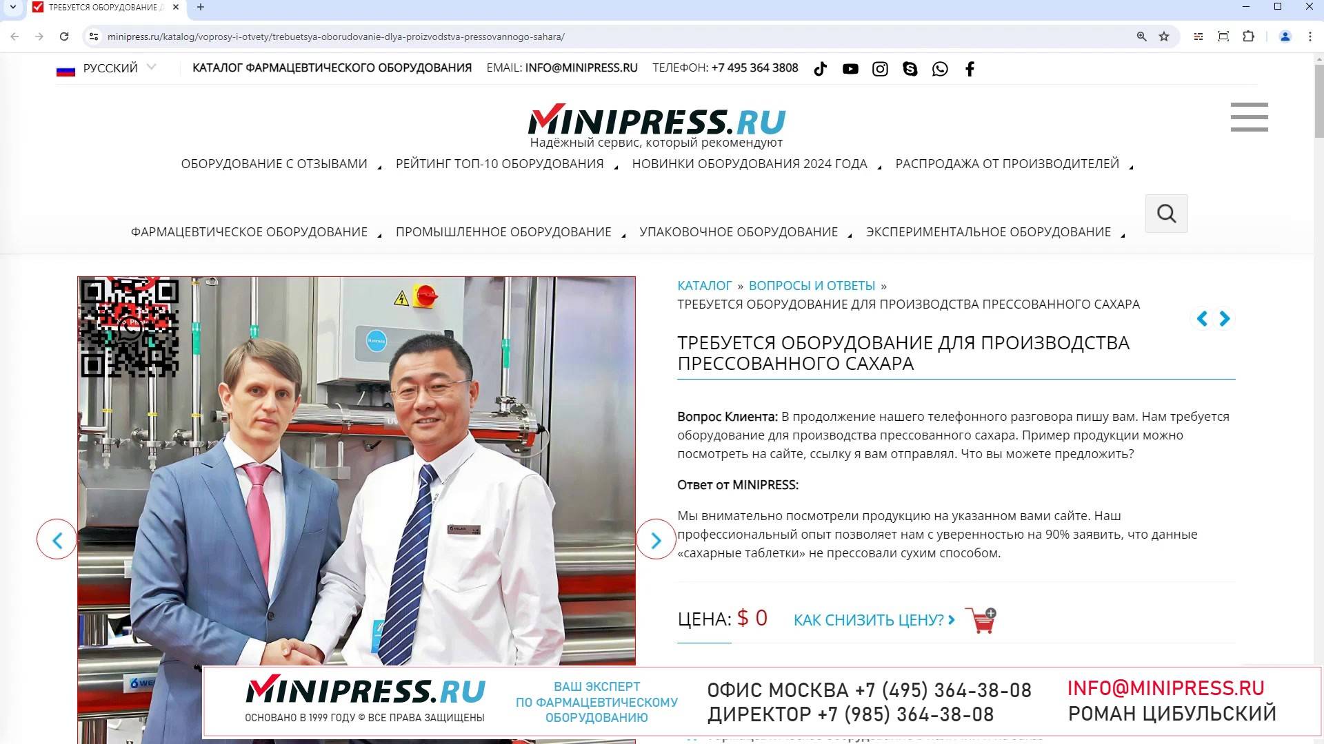 В нашем каталоге Компания MINIPRESS.RU большой выбор РОТОРНЫХ ТАБЛЕТОЧНЫЕ ПРЕССОВ для прессования таблеток из порошковых или гранулированных материалов. У нас самые надежные и современные лабораторные таблетпрессы для производства таблеток. Таблеточные машины и таблеточное оборудование выполненное по стандартам GMP. Механические и гидравлические пресса, настольные для лабораторий и промышленные для фармацевтических фабрик. Компания Романа Цибульского MINIPRESS.RU занимается поставкой большого ассортимента фармацевтического оборудования из Китая, Кореи, Индии, Европы и других стран. Мы выполняем работы по поиску, подбору, закупке, доставке, и таможенной очистке оборудования с доставкой в любой город России и стран СНГ. Основатель и ведущий специалист компании - Роман Цибульский. Компания MINIPRESS.RU (зарегистрированный товарный знак) основана в 2000 году. Онлайн каталог оборудования MINIPRESS.RU ежедневно посещают несколько тысяч человек. Мы развиваем крупные каналы в социальных сетях, посвященные тематике фармацевтического оборудования. Вы можете посмотреть видео ролики об оборудовании, которым мы занимаемся. Фактически у нас самый большой в России многоязычный каталог фармацевтического оборудования с фотографиями, описаниями, и что более важно с ценами и видео демонстрацией оборудования в работе. Подбор оборудования и консультации ведет сам владелец компании - Роман Цибульский. Компания имеет огромный опыт в работе с различным оборудованием, технологиями. Помогаем клиентам выбрать модель фармацевтического оборудования, которое сможет решить поставленную задачу. Наши специалисты помогают рекомендациями в решении проблем по эксплуатации оборудования. Наша компания имеет офис в г.Шанхай и несколько менеджеров, которые помогают в работе с китайскими поставщиками. Мы долго сотрудничаем и дружим с этими специалистами. Китайские поставщики ценят нас как постоянных партнеров. Роман Цибульский Директор компании Минипресс Поставка фармацевтического оборудования в Россию Пишите: info@minipress.ru Gmail: boss.minipress@gmail.com Офис в Москве +7(495)364-38-08 Мобильный +7(985)364-38-08 (WhatsApp) Каталог оборудования https://www.Minipress.ru/katalog/ МИНИПРЕСС.РУ В СОЦИАЛЬНЫХ СЕТЯХ FB https://facebook.com/roman.tsibulsky YOUTUBE https://www.youtube.com/@farmacevticheskoe_oborudovanie INSTAGRAM https://www.instagram.com/farmacevticheskoe_oborudovanie/ #продажи #капсулы #сортировка #технология #конвейер #вязкость #модернизация #финансы #насос #свойства