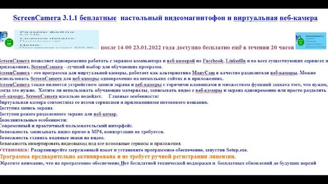 Программа ScreenCamera 3.1.1 работает как бесплатный Настольный видеомагнитофон с виртуальной веб-камерой источник https://ru.giveawayoftheday.com/screencamera-3-1-1-3/