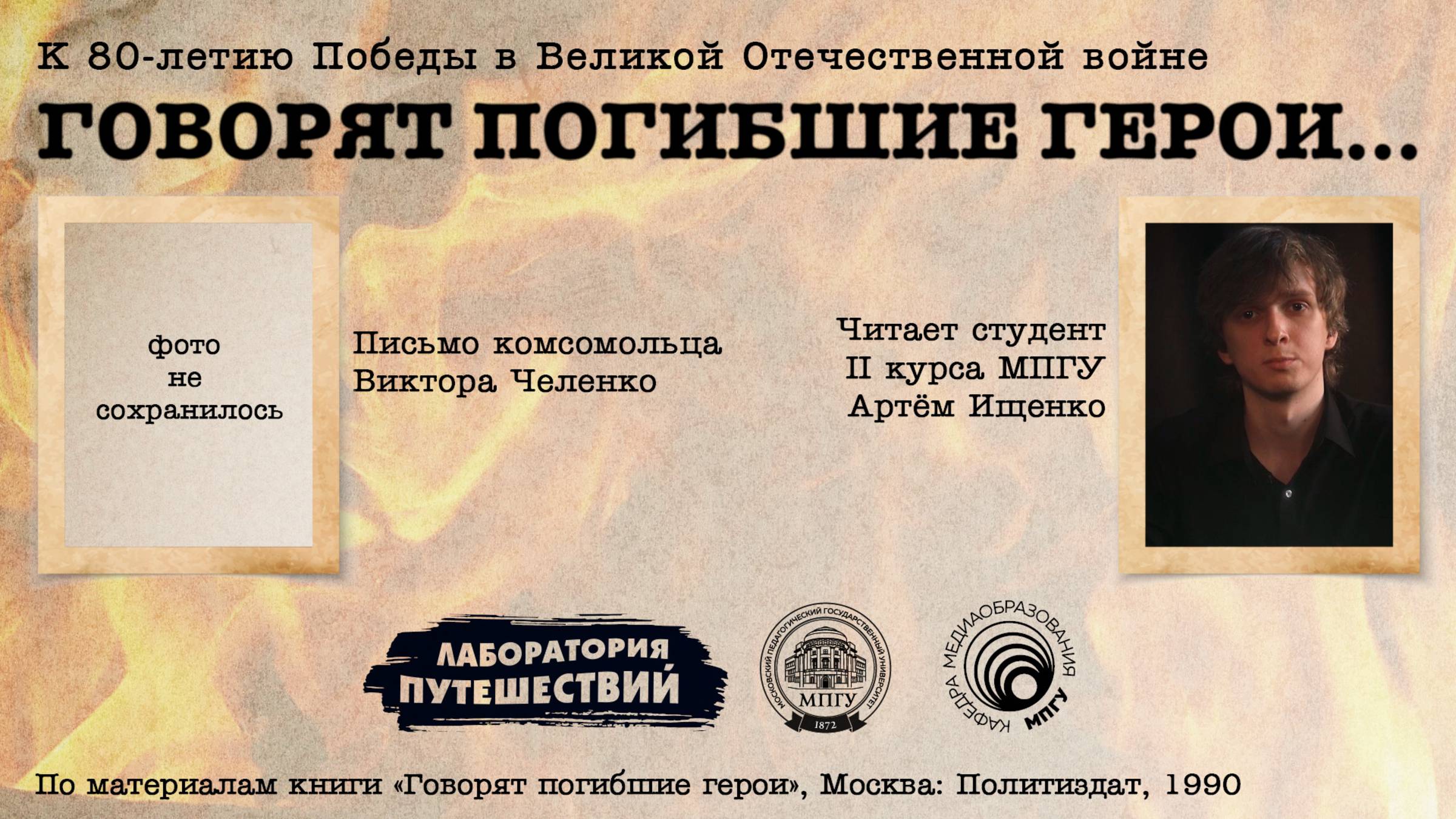 “Говорят погибшие герои”... Проект, посвященный 80-летию Победы в Великой Отечественной войне. За каждой историей стоят живые люди, герои, которые отдали жизнь за мирное небо, за своих жен, матерей и детей. Понимая, что могут не вернуться из самого страшного боя или фашистских застенков, они писали письма и записки родным, стараясь передать им надежду и веру. Благодаря голосам, звучащим сквозь строки, память об их подвиге останется навсегда. Комсомолец Виктор Чаленко, добровольно вступивший в армию в августе 1942 года, служил в морской пехоте, участвовал в ожесточенных боях за оборону Северного Кавказа. В феврале 1943 года Чаленко в составе десанта высадился на Малой земле у Новороссийска, вызвался ликвидировать огневую точку и ценой своей жизни уничтожил дзот гранатами. В его кармане нашли блокнот с прощальным письмом. За подвиг на Малой земле Виктор Чаленко посмертно награжден орденом Ленина. Читает Артем Ищенко, студент МПГУ группы МСС-2 (“Медиаобразование в социокультурной сфере”) Представляем вам совместный проект МПГУ и ГБУ “Лаборатория путешествий”. Производство – #проПоходТВ. Группа ВКонтакте МПГУ: https://vk.com/kafedra_media ГБУ “Лаборатория путешествий”: https://vk.com/goulp Канал о туризме #проПоходТВ: https://vk.com/club226767525 #СловоГероям #9мая #80летПобеде #МПГУ #ЛабораторияПутешествий #проПоходТв