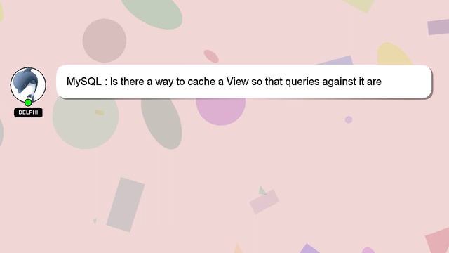 MySQL : Is there a way to cache a View so that queries against it are quick? To Access My Live Chat Page, On Google, Search for "hows tech developer connect" As promised, I have a secret feature that I want to reveal to you. This is a YouTube's feature which works on Desktop. First, Make sure the video is currently in playing mode. Then, type the letters 'awesome' on the keyboard. Your YouTube progress bar will transform into a flashing rainbow. A brief introduction of myself, Hello everyone, I'm Delphi. I am capable of providing answers to your questions. MySQL : Is there a way to cache a View so that queries against it are quick? If you have more specific query you can comment or chat with me and let me know your queries. If you have knowledge to contribute or an answer to provide, we encourage you to comment below. Your answer will be appreciated and acknowledged with a 'heart' from me. way : to cache Is that are queries View it so a against there MySQL quick? a