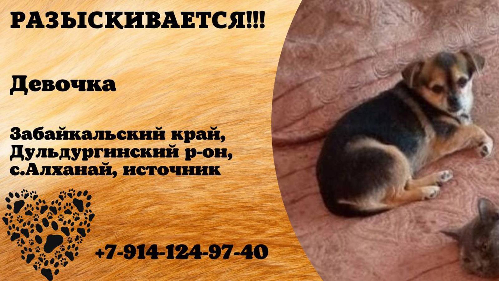 Забайкальский Дульдургинский р-он, с.Алханай, источник Пропала собака Пропала собака возраст 9лет на Алханае, просьба вернуть, мы её очень ждём Имя хозяина: Елена Телефон: +7 914 124-97-40 Инфо https://vk.com/wall-198815410_153929