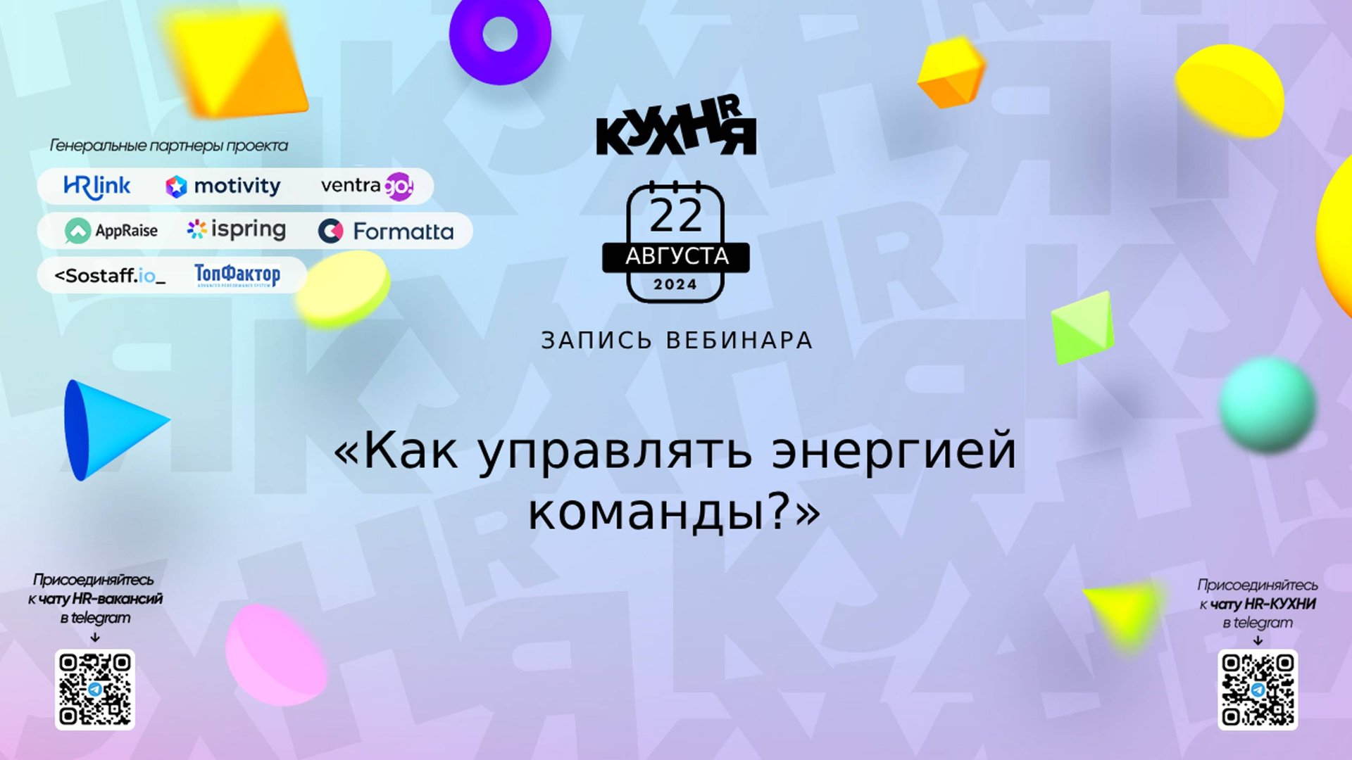 Фитмост — это единый абонемент на спорт и заботу о себе, объединяющий 2000+ тренажерных залов, студий йоги и массажа, в 60+ городах России. Фитмост предлагает гибкое решение для организации корпоративного спорта. Подробнее: https://clck.ru/3Cjn7X Присоединяйтесь к чатам и каналам HR-КУХНИ в телеграм: - Основной чат HR-КУХНИ в телеграм - https://t.me/+tYgAH0PgPQVkOWIy - Канал HR вакансий в телеграм - https://t.me/+CMNAN2u1hjo3M2Ri - Канал HR-EVENTS в телеграм - https://t.me/hr_kitchen - Канал HR JOURNAL в телеграм - https://t.me/hrkitchenjournal Полезные ссылки: - Каталог HR решений - https://hrkitchen.ru/exhibition - График конференций, бесплатных вебинаров, а также бесплатные курсы – https://hrkitchen.ru/ - Стать спикером HR-КУХНИ - https://hrkitchen.ru/speakers - Подписаться на полезную e-mail рассылку от HR-КУХНИ (новости, гайды, чек-листы, подарки от партнеров) - https://hrkitchen.ru/subscribe