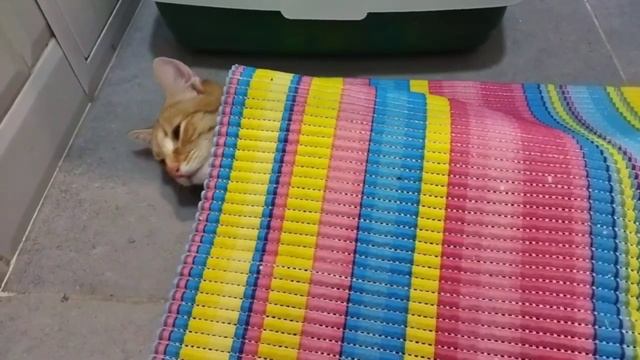 Кошка прячется под ковриком