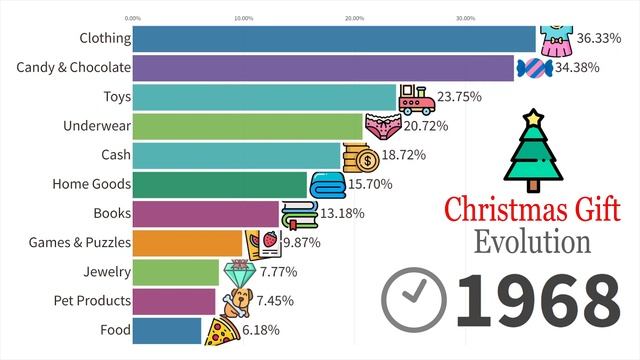 Данные о том, какие подарки люди дарят на Рождество с 1900 по 2024 год