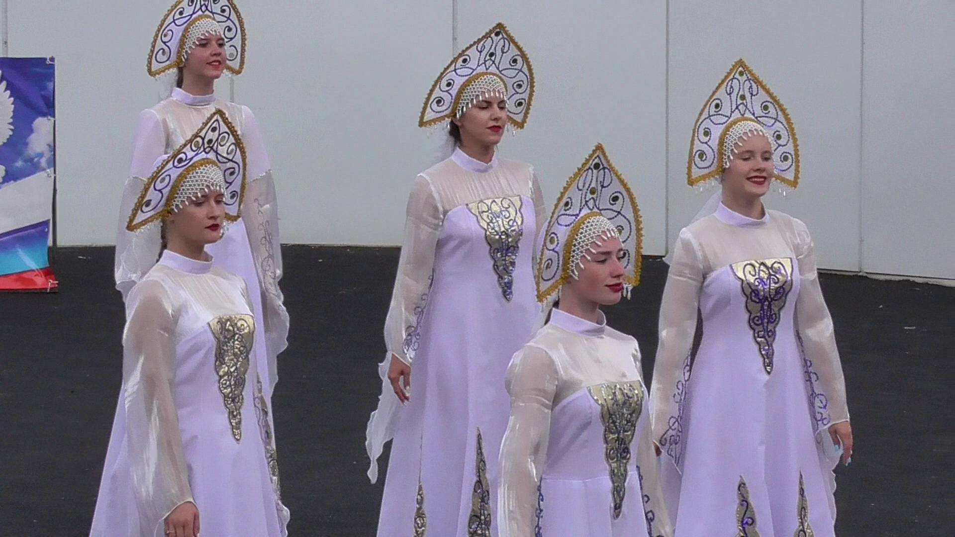 Танцевальный ансамбль в белых костюмах