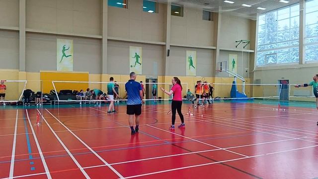 Тренировочная игра в бадминтон через сетку. Играют любители, новички и опытные бадминтонисты. Игра на сборах в доме отдыха Снегири от клуба Искра 6-8 декабря 2024 #badminton #badmintonlovers #badmintonrussia #бадминтон #искра #iskra #snegiri #снегири