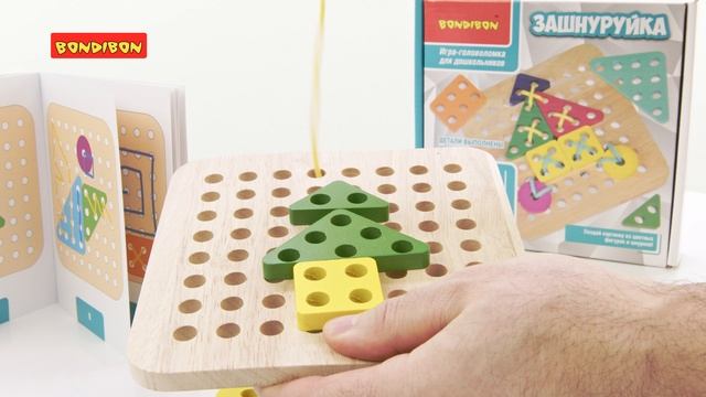 "Соберите картину с помощью настоящих шнурков! Игра «ЗАШНУРУЙКА» из серии «БондиЛогика» от Bondibon развивает память, ловкость, мелкую моторику, пространственное мышление, помогает освоить навыки шнуровки Вашему малышу и способствует изучению цветов. А также позволит в игровой форме познакомиться с навыком шитья. Выбирайте одно из изображений в книжке с заданиями и повторяйте его, вдевая шнуровку в отверстия игрового поля. Шнуровки вдевайте в деревянные детали согласно инструкции. Для ребенка будет интересной задачей собрать из разных фигур картинку, а потом пришить ее шнурками к планшету. Детали игры выполнены из настоящего дерева и покрыты безопасными красками. Игра предназначена для одного игрока. В комплекте: планшет, 10 различных геометрических фигур, 2 шнурка, инструкция с возможными вариантами картинок. Размер см: 19,5х4,5х18,5 Возраст: 3+ Проведите время с вашим малышом весело и интересно с помощью увлекательной игры ""ЗАШНУРУЙКА""!"