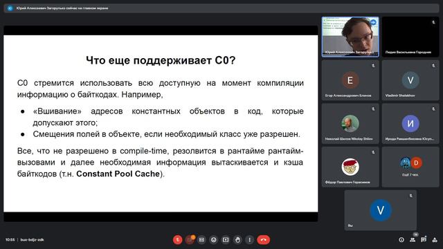 1. Докладчик: Гафиятуллин Альберт (ФИТ НГУ, Новосибирск) Тема: Ступенчатая JIT-компиляция в виртуальной машине Java на платформе Эльбрус 2. Герасимов Фёдор (ММФ НГУ, Новосибирск) Тема: Методы решения недоопределенных систем линейных уравнений для задачи удовлетворения геометрических ограничений в САПР