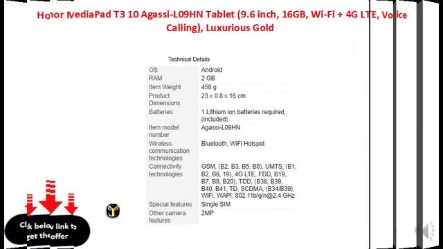 https://www.amazon.in/Honor-MediaPad-Agassi-L09HN-Calling-Luxurious/dp/B07GKPQHRR/ref=sr_1_5?tag=jpstorenkl-21 5MP primary camera and 2MP front facing camera 24.384 centimeters (9.6-inch) capacitive touchscreen with 1280 x 800 pixels resolution Android v7.0 Nougat EMUI 5.1 operating system with 1.4GHz Qualcomm MSM8917 quad core processor, 2GB RAM, 16GB internal memory expandable up to 128GB and single SIM 4800mAH lithium-ion battery 1 year manufacturer warranty for device and 6 months manufacturer warranty for in-box accessories including batteries from the date of purchase https://www.amazon.in/Honor-MediaPad-Agassi-L09HN-Calling-Luxurious/dp/B07GKPQHRR/ref=sr_1_5?tag=jpstorenkl-21