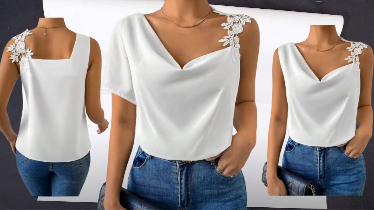 🧵 Рекомендуемые ткани: Лучшие ткани для этого дизайна — мягкий атлас или лёгкий шифоновый креп. Важно: Ткань должна хорошо драпироваться, чтобы драпировка красиво ложилась на тело. 🧵 Расход ткани: Размеры XS–M: примерно 1,25 метра Размеры L–XL: примерно 1,5 метра Размеры 2XL–3XL: примерно 1,75 метра (При ширине ткани: 140 см) 🧵 Длина изделия: Длина от плеча до низа составляет примерно 50–55 см, доходя чуть выше пояса джинсов (как показано на изображении). Если вы хотите удлинить модель до бедер, добавьте 10–15 см. 🧵 Детали дизайна: Асимметричный вырез с драпировкой, который спадает на одно плечо. Вырез создаёт мягкие, женственные линии на груди. Асимметричный крой с одним коротким рукавом и полностью открытым плечом. Открытое плечо декорировано цветочным кружевом или гипюром, придавая уникальность изделию. Цветочные кружевные элементы с безрукавной стороны придают блузке мягкий и женственный вид. Эти украшения можно пришить вручную или приобрести в магазинах фурнитуры. 🧵 Крой и стиль: Стиль свободный и полуприлегающий, позволяющий ткани естественно ложиться по телу. Асимметричный крой придаёт образу современный и стильный вид. Молния не используется, так как широкий вырез позволяет легко надевать изделие через голову. Однако при использовании неэластичной ткани можно добавить потайную молнию сбоку для удобства. 🧵 Диапазон размеров: Подходит для размеров от XS до 3XL с незначительными изменениями выкройки. 🧵 Подходит для следующих типов фигуры: Тип «яблоко»: смещает акцент с талии на вырез и плечи. Тип «песочные часы»: свободный крой можно подогнать, что делает модель идеальной для этой фигуры. Тип «груша»: акцентирует внимание на верхней части тела, уравновешивая силуэт. Тип «перевёрнутый треугольник»: можно убрать кружево и добавить короткие рукава с обеих сторон для более сбалансированного образа.