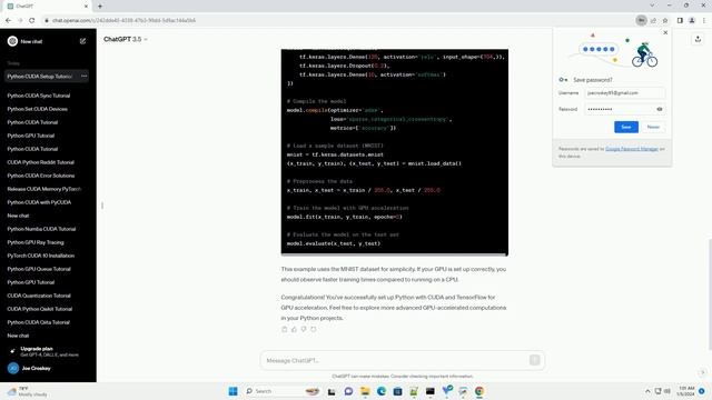 Download this code from https://codegive.com Setting up Python with CUDA (Compute Unified Device Architecture) allows you to harness the power of NVIDIA GPUs for parallel computing, which is especially useful for tasks like machine learning, deep learning, and scientific computing. In this tutorial, we'll walk through the steps to set up Python with CUDA and provide a simple code example using the popular deep learning library TensorFlow. Before working with CUDA, ensure you have the latest NVIDIA GPU drivers installed on your system. Visit the official NVIDIA website to download and install the appropriate drivers for your GPU. Download and install the CUDA Toolkit from the NVIDIA CUDA Toolkit website (https://developer.nvidia.com/cuda-downloads). Make sure to select the version compatible with your GPU and operating system. cuDNN (CUDA Deep Neural Network library) is a GPU-accelerated library for deep neural networks. Download cuDNN from the NVIDIA cuDNN website (https://developer.nvidia.com/cudnn) and follow the installation instructions. Now, let's set up Python with TensorFlow, a popular deep learning library that supports GPU acceleration through CUDA. To ensure that TensorFlow is using your GPU, run the following Python code: If everything is set up correctly, you should see the name of your GPU in the output. Let's run a simple TensorFlow example to confirm that GPU acceleration is working: This example uses the MNIST dataset for simplicity. If your GPU is set up correctly, you should observe faster training times compared to running on a CPU. Congratulations! You've successfully set up Python with CUDA and TensorFlow for GPU acceleration. Feel free to explore more advanced GPU-accelerated computations in your Python projects. ChatGPT
