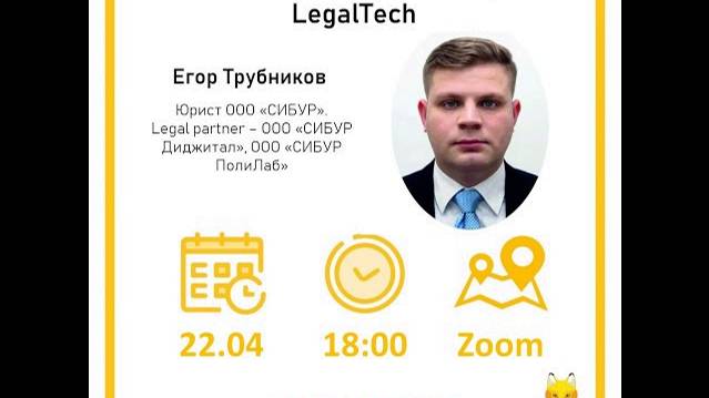 ❗22 апреля (вторник) в 18:00 состоится тринадцатая лекция курса мастер-классов «Особенности работы инхаусов. LegalTech» Егора Трубникова. ❓В рамках лекции будут рассмотрены следующие вопросы: - Что такое LegalTech? - Структура и основные направления LegalTech - Примеры применения LegalTech в современном правовом департаменте ⭐О лекторе: Трубников Егор Сергеевич, юрист ООО «СИБУР». Legal partner – ООО «СИБУР Диджитал», ООО «СИБУР ПолиЛаб». Окончил с отличием бакалавриат и магистратуру Юридического института Национального исследовательского Томского государственного университета, магистрант Национального исследовательского Московского авиационного института (специальность - «Информатика и вычислительная техника»). Занимается сопровождением IT, текущей деятельности юридических лиц, входящих в группу, вопросами интеллектуальной собственности, защиты персональных данных, претензионно-исковой работой, внедрением инструментов legal tech в юридическом департаменте СИБУР. В СИБУРе с 2018 года. До этого 2,5 года работал в Следственном комитете РФ. Таймкоды: 00:00 представление лектора и темы лекции 01:24 юристы прошлого vs юристы будущего 03:06 причины внедрения Legal Tech 06:15 сферы использования технологий в работе юриста 07:01 зачем юрдепу СИБУРа цифровизация? 09:11 карта Legal Tech на российском рынке 10:39 что такое электронная подпись? 11:35 электронный vs бумажный документ 14:13 что такое Legal Design и зачем он юристам? 16:50 несколько правил Legal Design 20:22 процессуальные документы с точки зрения Legal Design 22:17 IT в правосудии 26:04 KYS и DD tools: что это и зачем? 29:53 конструкторы документов 33:11 как Big Data могут помочь юристу? 36:00 зачем управлять знаниями и как это делать? 39:32 как работают smart контракты? 43:43 о государственных информационных системах и их пользе 48:57 ключевые инструменты Legal Tech в работе юрдепа СИБУРа 55:21 нужно ли юристу знание языка программирования? 59:25 графическая составляющая договора: «очень тонкая грань» 1:04:52 взаимодействие на юридическом рынке в сфере Legal Tech 🦊 Где пройдет л��кция? Zoom: 842 2569 8523 Youtube: Канал MoscowLawyers Не прогуляй свое будущее!