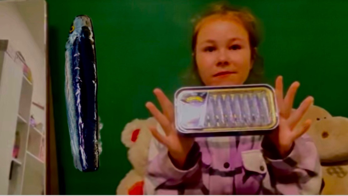 Вика первый раз пробует рыбку . Сардины оказались шоколадными с молочной начинкой .