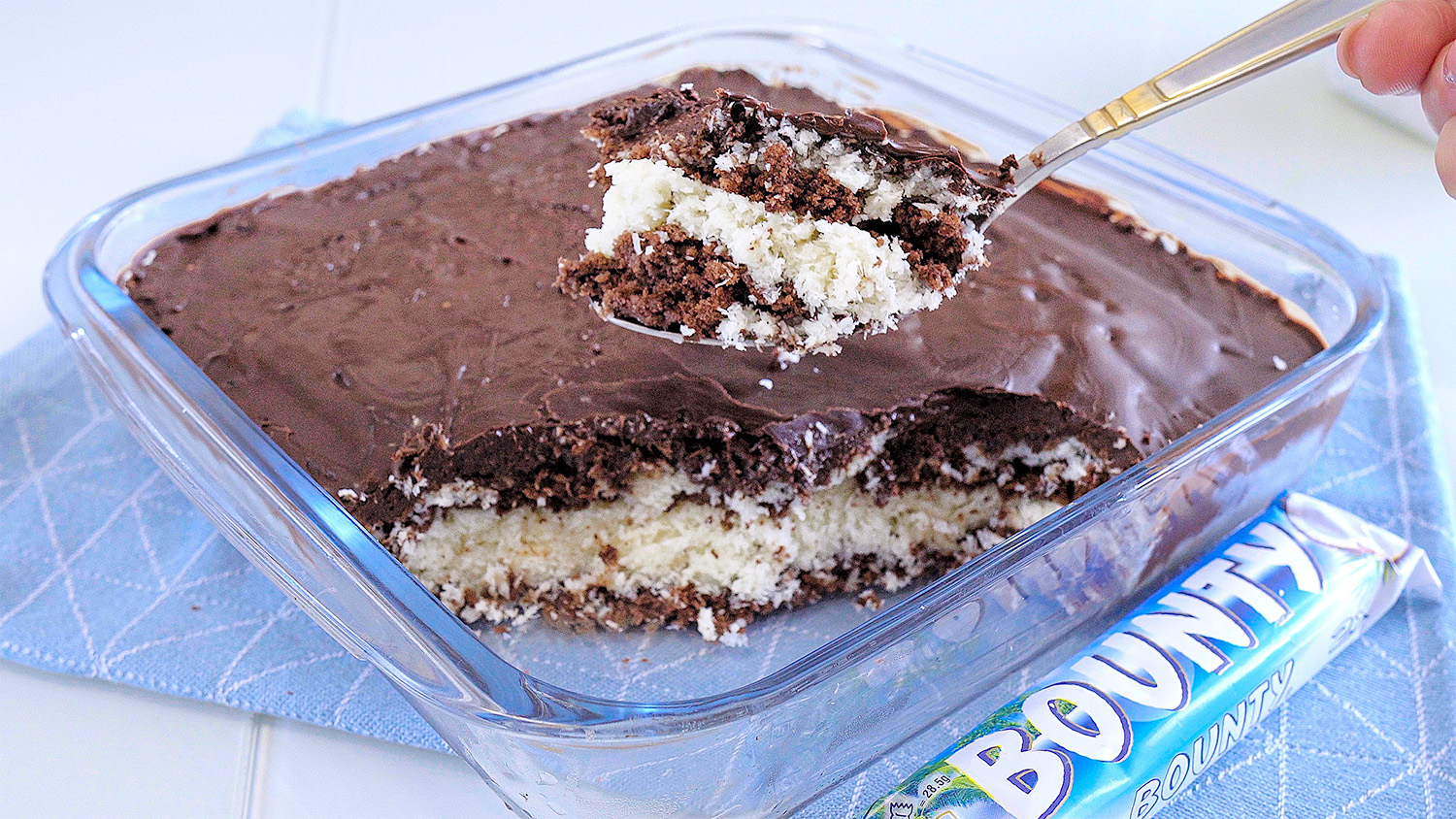 Яйца ? (2 шт). Сахар (40 г). Щепотка соли. Мука (35 г) + какао (10 г) + разрыхлитель (1/4 ч л). Растительное масло (15 мл). Выпекать при 180 °C 15 минут. Крем: Молоко (200 мл). Сахар (80 г). Сгущенное молоко (100 г). Сливочное масло ? (100 г). Кокосовая стружка (150 г). Доведите до кипения и варите 3 минуты. Молоко или сливки. Шоколад ? (150 г) + растительное масло (30 мл). Растапливаем в микроволновке на функции разморозки или на водяной бане. Охладить 10-15 минут. #торт #баунти