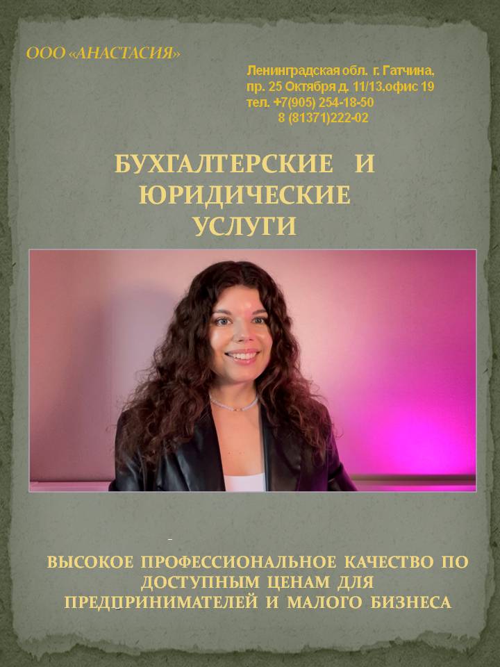 ООО "Анастасия", юридическая фирма. Бухгалтерские и юридические услуги в Гатчине. Страхование жизни. ООО "Анастасия" предлагает все виды БУХГАЛТЕРСКИХ УСЛУГ для ООО и ИП по всем системам налогообложения. Ведение бухгалтерского учета в программе "1С:Предприятие". Консультации по вопросам бухгалтерского учета и налоговой отчетности. Подготовка и сдача бухгалтерской и налоговой отчетности в ИФНС, ПФР, ФСС. Помощь гражданам (физическим лицам) в оформлении и сопровождении документов в налоговую инспекцию для возврата 13% затраченных на средства: - приобретение квартиры, строительство дома (имущественный вычет); - оплата обучения (своего и ребенка) в учебных заведениях; - платные медицинские услуги; - вычет по индивидуальному инвестиционному счету (ИИС); - вычет по договорам накопительного страхования жизни. ЮРИДИЧЕСКИЕ УСЛУГИ Ведение арбитражных и гражданских дел. Представительство в судах, в налоговых органах и других организациях. Составление различных видов договоров. СТРАХОВАНИЕ ЖИЗНИ ("Ренессанс Жизнь"). Программы компании "Ренессанс Жизнь" созданы для того, чтобы поддержать нас на каждом этапе жизни и дать уверенность в завтрашнем дне, независимо от обстоятельств. Мы формируем нас жизненный капитал, который будет для нас опорой на протяжении многих лет. Программы для детей- оптимальный и выгодный инструмент для создания материального фундамента к вступлению ребенка во взрослую жизнь, накопления для получения высшего образования, вступительный взнос на жилье. Ленинградская обл., г. Гатчина, пр. 25 Октября, д. 11/13, офис 19 Тел./факс: 8 (81371) 2-22-02 Тел. 8 (905) 254-18-50 В Интернете (в поисковиках) нас находят, в частности, по таким словам: бухгалтерские услуги Гатчина, ведение бухгалтерского учета Гатчина, юридические услуги Гатчина. #бухгалтерскиеуслуги #Гатчина #ведениебухгалтерскогоучета #бухучет #Гатчинскийрайон #Ленинградскаяобласть #юридическиеуслуги