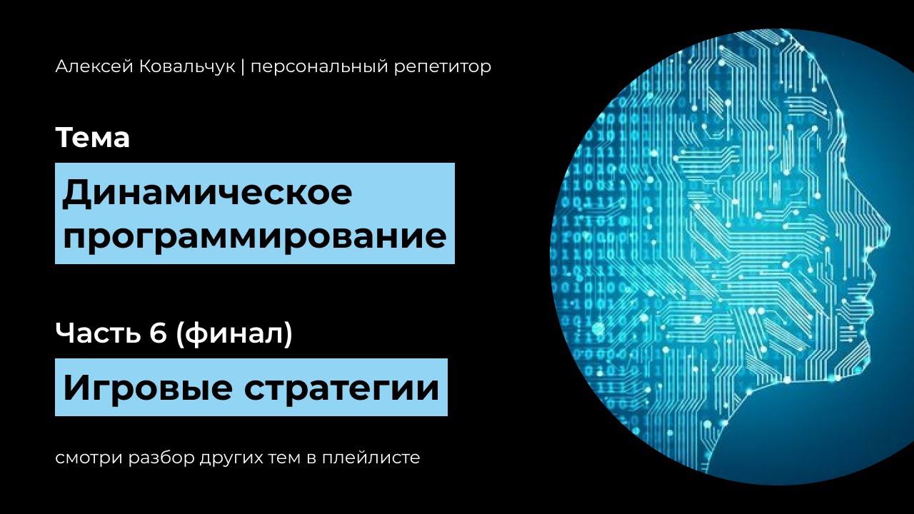 Учи алгоритмы вместе со мной! Ссылка на курс: https://stepik.org/a/184350 Мои курсы по изучению Python: 1. Python - ПОЛНЫЙ КУРС (часть 1): https://stepik.org/course/174852 2. Python - ПОЛНЫЙ КУРС (часть 2): https://stepik.org/a/186192 *** Все курсы на Stepik: https://stepik.org/users/623224055 *** Рекомендую подписаться на открытый канал. В нем обсуждаем стажировки, программирование и многое другое, а также там я в первую очередь делаю все анонсы: https://t.me/analitiqtutor *** Прокачивай себя вместе со мной! Записаться на занятия можно здесь: Написать в Telegram: https://t.me/analitiqq Написать в ВК: https://vk.com/analitiqvk *** Таймкоды: 00:00 Вступление 02:25 Пример простой задачи 08:09 Задача 1 16:54 Задача 1 (веселое решение) 20:05 Задача 2 (из ЕГЭ) 32:19 Задача 3 (без кода) 34:12 Вывод *** Теги: #алгоритмы #программирование #python *** Финальное видео по теме "Динамическое программирование". В этом разборе рассматриваем базовые задачи, связанные с игровыми стратегиями и их реализацию с помощью методов динамического программирования. Приятного просмотра. *** Решения тут: https://github.com/blacksmithalex/informatics