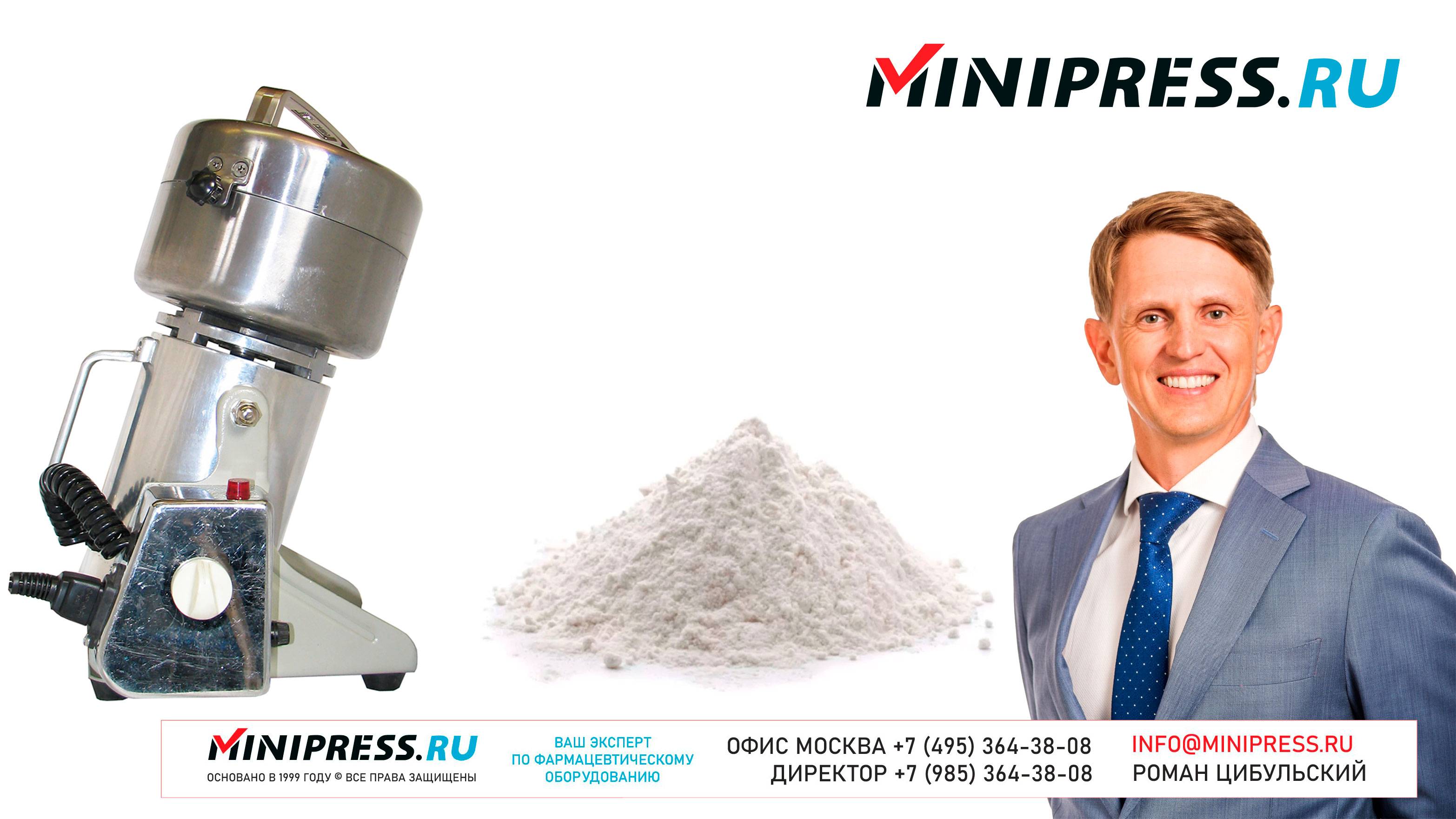 Автоматическая лабораторная мельница ножевого типа PRO-02 https://Minipress.ru/katalog/ Фармацевтическое оборудование. Специалисты в фармацевтическом оборудовании и технологиях производства лекарств. Более 20 лет оказываем нашим клиентам помощь в выборе, поставке, наладке различного фармацевтического оборудования! Вы в поиске надежного поставщика оборудования? Мы предоставим вам лучший сервис 24/7. Собрана лучшая команда профессионалов в фармацевтической отрасли и налажены стабильные связи с лучшими производителями. Мы не только продаем, но и производим многие модели оборудования Директор компании Минипресс Роман Цибульский Поставка фармацевтического оборудования в Россию Пишите: info@minipress.ru Телефон +7(495)364-38-08; Мобильный +375(29)308-00-00 Россия, Москва Skype: RomanTsibulsky; ICQ: 310-134-490 Подписывайтесь на наш видео канал на Youtube https://youtube.com/user/wwwMinipressru Обновленный сайт https://Minipress.ru Каталог оборудования https://Minipress.ru/katalog/ МЫ В СОЦИАЛЬНЫХ СЕТЯХ G+ https://plus.google.com/+RomanTsibulsky/ FB https://facebook.com/roman.tsibulsky YOUTUBE https://youtube.com/user/wwwMinipressru IN https://ru.linkedin.com/pub/roman-tsibulsky/a6/933/661 БОЛЬШОЙ КАТАЛОГ ФАРМАЦЕВТИЧЕСКОГО ОБОРУДОВАНИЯ https://minipress.ru/katalog/ Постоянно обновляемый каталог различного фармацевтического оборудования с фотографиями, описаниями, видео и ценами. ПЕРСОНАЛЬНЫЙ МЕНЕДЖЕР 24 ЧАСА https://minipress.ru/katalog/ Вы общаетесь по всем вопросам, с момента первой консультации и до получения оборудования, с одним специалистом. СПЕЦИАЛИСТЫ И ТЕХНОЛОГИ https://minipress.ru/katalog/ Имеем обширные связи в фармацевтической среде, найдем любого специалиста, поможем с освоением оборудования и технологий. ОБСУЖДЕНИЕ ВАШИХ ИДЕЙ ПО ПРОИЗВОДСТВУ ПРОДУКЦИИ https://minipress.ru/katalog/ Поможем в оценке ваших идей. Большой опыт в организации различных производств и выпуске продукции. Ценные советы. ФАРМАЦЕВТИЧЕСКОЕ ОБОРУДОВАНИЕ Мы поставили перед собой задачу, помогать нашим клиентам в правильном выборе фармацевтического оборудования. Многолетний опыт подобной деятельности показывает, что многие клиенты сталкиваются, в первую очередь, с непониманием технологического процесса. Покупка оборудования должна быть финальной точкой после подробного обсуждения задачи, консультацией с производителем оборудования, отправкой сырья и материалов на фабрику, тестирования в работе. ДЛЯ ТАБЛЕТОК https://minipress.ru/katalog/category/farmacevticheskoe_oborudovanie/ Смешивание порошков, гранулирование, прессование, обеспыливание, покрытие оболочками, фасовка, упаковка, счет, нанесение логотипов ДЛЯ ЖЕЛАТИНОВЫХ КАПСУЛ https://minipress.ru/katalog/category/farmacevticheskoe_oborudovanie/kapsulyatory-dlya-tverdyh-zhelatinovyh-kapsul/ Фасовка порошков и масел, обеспыливание, счет и фасовка, упаковка, нанесение логотипов. ФАСОВКА И УПАКОВКА https://minipress.ru/katalog/category/upakovochnoe_oborudovanie/ Упаковка в пластиковые и стеклянные флаконы, блистер, фольгу, ламинированную бумагу, стеклянные ампулы, саше, стрипы, тубы, тюбики, контурную ячейку. ТЕХНОЛОГИЧЕСКОЕ https://minipress.ru/katalog/category/eksperimentalnoe-oborudovanie/ Лабораторное, аналитическое, подготовительное, отдельные машины и линии под ключ. СФЕРЫ ДЕЯТЕЛЬНОСТИ Наша компания занимается множеством направлений фармацевтического бизнеса! Предлагаем Вам посетить страницы нашего сайта https://www.Minipress.ru по различным специализациям. ОБОРУДОВАНИЕ ДЛЯ НАКЛЕЙКИ ЭТИКЕТОК НА БУТЫЛКИ АМПУЛЫ ФЛАКОНЫ https://minipress.ru/katalog/oborudovanie-s-otzyvami/oborudovanie-dlya-naklejki-etiketok-na-butylki-ampuly-flakony/ Автоматическое этикетировочное оборудование для этикеток на клеевой 
