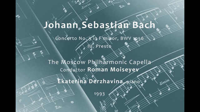 И.С.Бах. Концерт № 5 фа минор, BWV 1056. Московская филармоническая капелла. Художественный руководитель и главный дирижер Роман Моисеев. Екатерина Державина, фортепиано. Запись 1993 года с концерта в Московской консерватории. Johann Sebastian Bach. Concerto No. 5 in F minor, BWV 1056. III. Presto. The Moscow Philharmonic Capella. Artistic Director and Chief conductor. Ekaterina Derzhavina, piano. 1993. Live. Moscow State Conservatory.