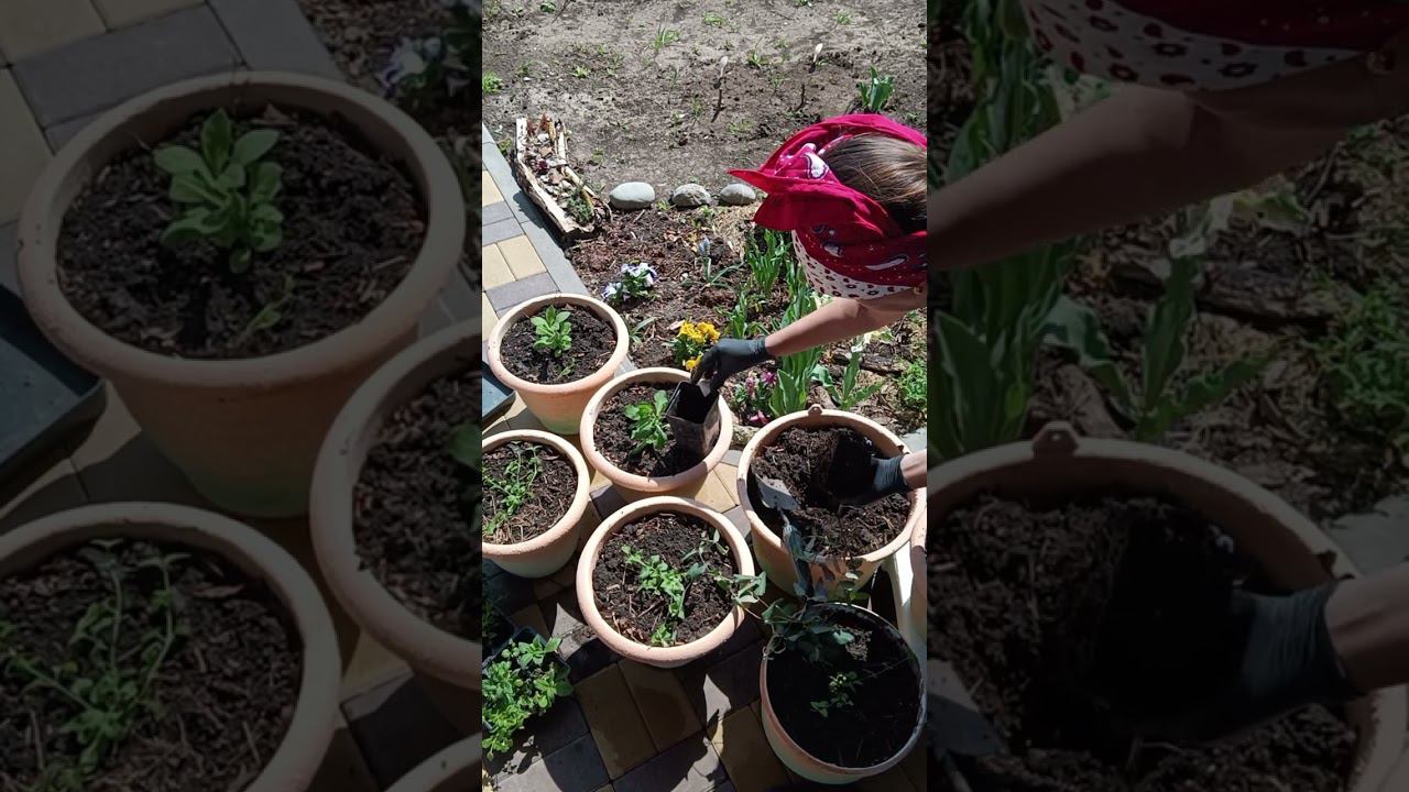 Высадка рассады цветов в кашпо для украшения сада.