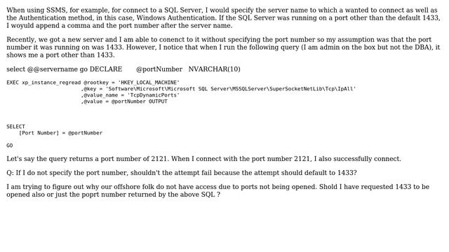 What ports do I need to open for offshore to access our SQL Server db? Helpful? Please support me on Patreon: https://www.patreon.com/roelvandepaar With thanks & praise to God, and with thanks to the many people who have made this project possible! | Content (except music & images) licensed under CC BY-SA https://meta.stackexchange.com/help/licensing | Music: https://www.bensound.com/licensing | Images: https://stocksnap.io/license & others | With thanks to user jotap (superuser.com/users/416336), user Chad (superuser.com/users/19700), and the Stack Exchange Network (superuser.com/questions/885542). Trademarks are property of their respective owners. Disclaimer: All information is provided "AS IS" without warranty of any kind. You are responsible for your own actions. Please contact me if anything is amiss at Roel D.OT VandePaar A.T gmail.com