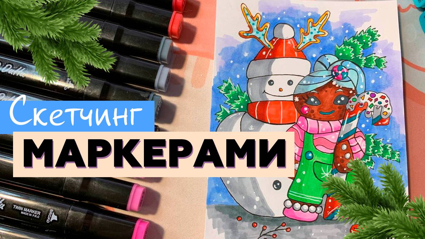 Новогодняя открытка маркерами. Раскраска