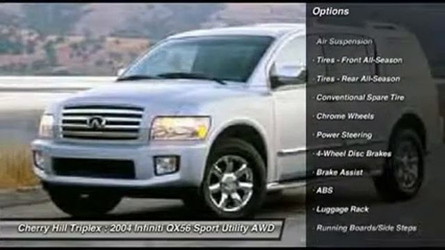 1-866-488-2222 | http://www.cherryhilltriplex.com 2004 INFINITI QX56 Cherry Hill, NJ Stock# 03625 866 4882222 www.cherryhilltriplex.com/ For more information on this vehicle and our full inventory, call 866 4882222. Cherry Hill Triplex (CherryHillTriPlexUSED) 1708 Marlton Pike W Cherry Hill, NJ 08002-3296 Don't miss this 2004 Infiniti QX56. It's equipped with Automatic transmission and features a Liquid Onyx exterior. With 134825 miles, you'll want to take this car home. Make a great choice today. Contact us and see this car first hand.