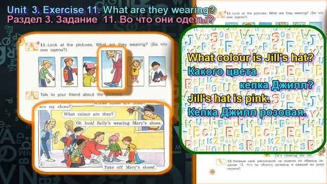 11 задание, 20 страница, 3 раздел, 3 класс. учебник Вербицкая Английский язык At the swimming pool. В плавательном бассейне. 11. Look at the pictures (Посмотри на картинки). What are they wearing? ( Во что они одеты?) Talk to your friend about the pictures. Поговори с другом об этих картинках. What's Mary wearing? She's wearing Jill's jumper. What's this? What colour is Jill's hat?
