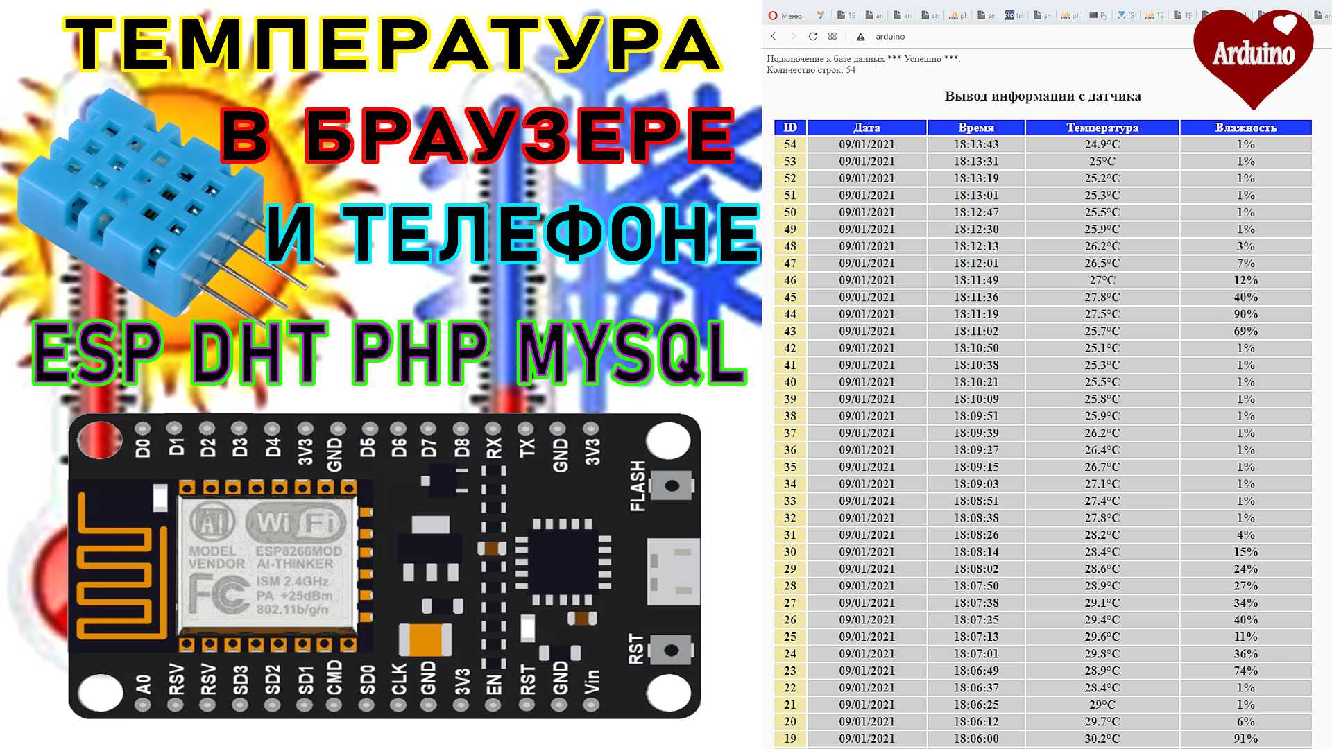 как передать температуру на сервер по WIFI и сохранить температуру в базе данных. Сегодня я покажу как просто передать температуру на локальный сервер используя WIFI и сохранить температуру и влажность в базе данных MYSQL используя для этого локальный сервер Open Server. Вывести на экран монитора или телефона температуру. Скетчи используемые в видео можно скачать на сайте "Ардуино для начинающих". http://arduino-kid.ru/blog/kak-peredat-temperaturu-na-server-po-wifi-i-sokhranit-temperaturu-v-baze-dannykh Вы узнаете как установить и подключить датчик температуры, сохранять и выводить на экран данные.сортировать от меньшего к большему и наоборот.Создавать постраничную навигацию.