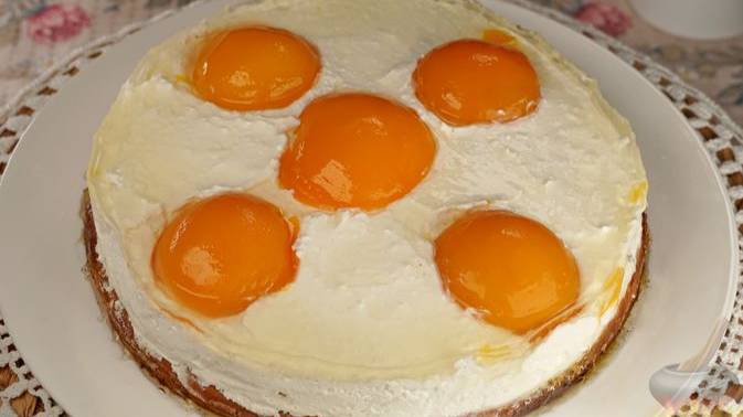 Десертная выпечка имитирует яичницу. Вкус этому виду, конечно же, соответствовать не будет - классическое кексовое тесто дополнено сливочно-творожным кремом и консервированными персиками, залитыми в прозрачное желе. Вкусно и эффектно. #КексовоеТесто #ДомашнийТорт #СливочноСырныйКрем #ТортСЖеле #ПерсиковыйТорт