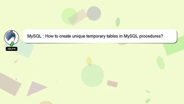 MySQL : How to create unique temporary tables in MySQL procedures? To Access My Live Chat Page, On Google, Search for "hows tech developer connect" As promised, I have a hidden feature that I want to share with you. This is a YouTube's feature which works on Desktop. First, Make sure the video is currently in playing mode. After that, type the word 'awesome' on your keyboard. The progress bar on YouTube will be altered to a flashing rainbow. A brief presentation of myself, Hi, my name is Delphi, nice to meet you. I am at your disposal to help you with any questions you have. MySQL : How to create unique temporary tables in MySQL procedures? I am available to answer your more detailed queries via comments or chat. Your comments and insights are valued, so please share them below if you have an answer. If you provide an answer, I will 'heart' it as a sign of gratitude. How : procedures? MySQL temporary create to tables unique MySQL in