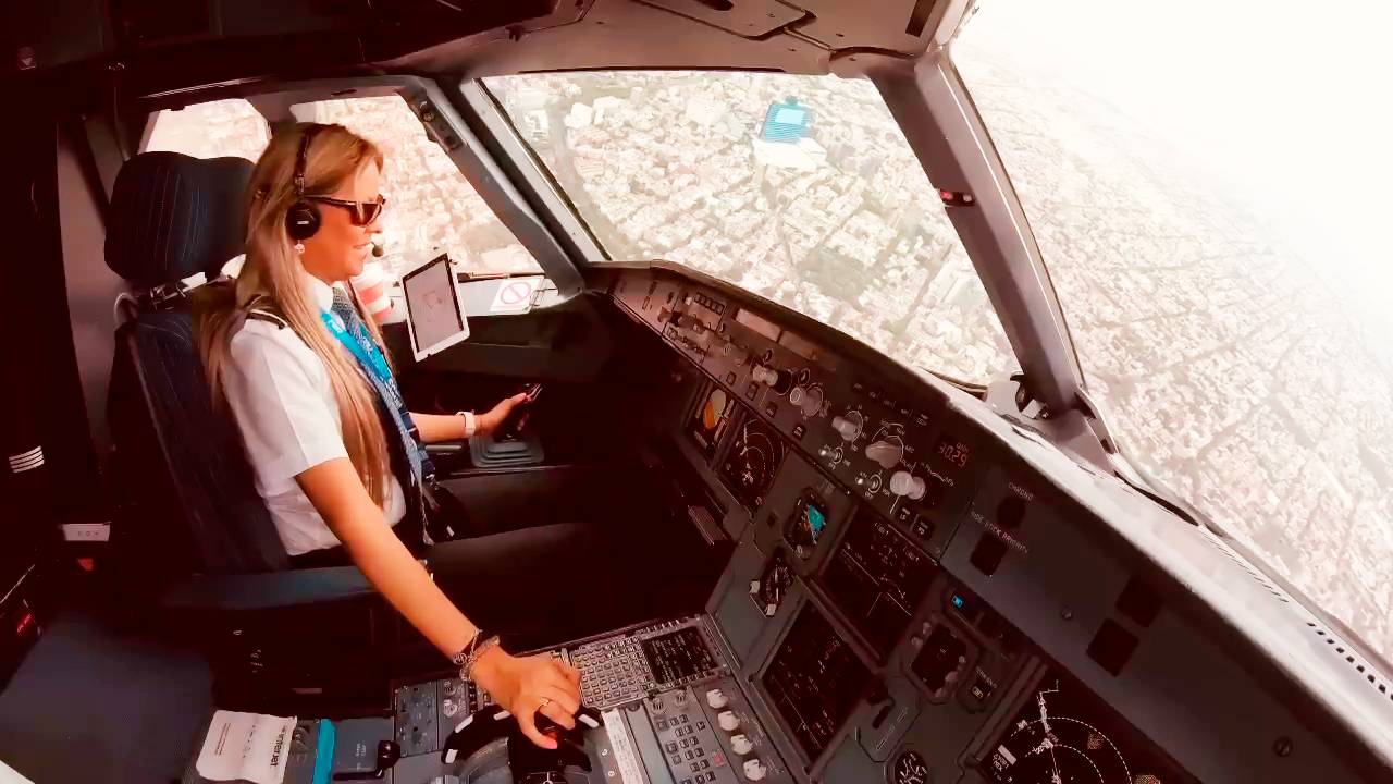 Девушка пилот самолета гражданской авиации приземляется Посадка Аэробус А320