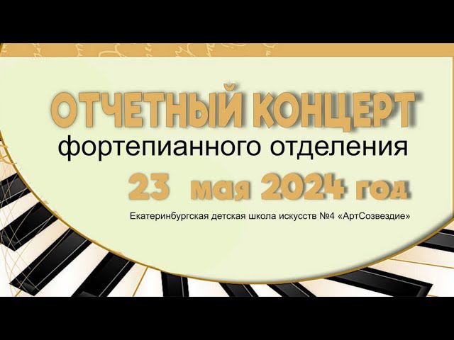 23 мая 2024 года в актовом зале Екатеринбургской детской школы искусств № 4 «АртСозвездие» состоялся отчётный концерт класса фортепиано. На сцене выступали учащиеся младших и старших классов. В зале звучала музыка композиторов разных стран и эпох: прелюдии И.С.Баха, марш Р.Шумана, пьесы В. Гиллока, сочинения Ж. Бизе, С. Майкапара, Д. Шостаковича. Приглашаем Вас на наши концерты!