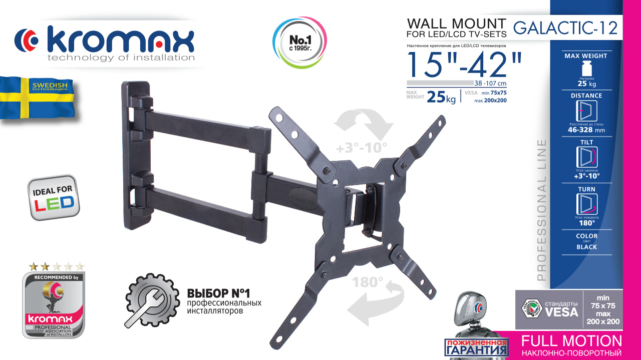 KROMAX GALACTIC-12 BLACK надёжно удержит экран размером 15"-42" дюйма и весом 25 кг. Простая конструкция KROMAX GALACTIC-12 BLACK идеально подойдет для самостоятельного монтажа. Наклонно-поворотная регулировка позволит наклонять вверх и вниз на +3 -10°, поворачивать влево и вправо на 180°, и выдвигать на 46-328 мм. Кронштейн подходит для большинства телевизоров популярных брендов, таких как Samsung, LG, Sony, Panasonic, Sharp, Toshiba, KIVI, Xiaomi Mi, SUPRA, Hyundai, Erisson, Horizont, JVC, Thomson, HAIER, BBK, Витязь, Веко, BQ, OZON, SkyLine, Pioneer, Philips, Rolsen, Harper, Hisense, Hitachi, Polarline, Prestigio и других. Крепёжные отверстия KROMAX GALACTIC-12 BLACK изготовлены по стандарту VESA. В комплектацию KROMAX GALACTIC-12 BLACK входят необходимые для монтажа материалы. Вся продукция обеспечивается гарантийными обязательствами. Пожизненная гарантия на все сварные и механические соединения позволит наслаждаться конструкцией долгий срок. Во время эксплуатации KROMAX GALACTIC-12 BLACK демонстрирует поразительную износостойкость и безотказность. Подробнее https://www.kromax.ru/produce/pan_tilt/3381/